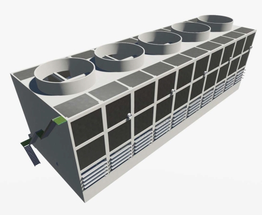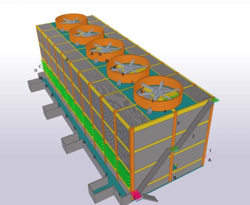 The structure of the tower as well as its columns and beams are produced with GRP. Various parts of the tower in direct contact with water such as drift eliminators, the water distribution system, and the fill are made of corrosion-resistant material like PVC, PP, GRP or stainless steel . Furthermore, the cold water basin at the bottom of the cooling tower can also be produced with GRP.