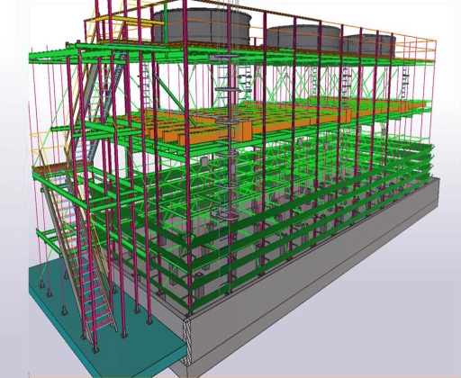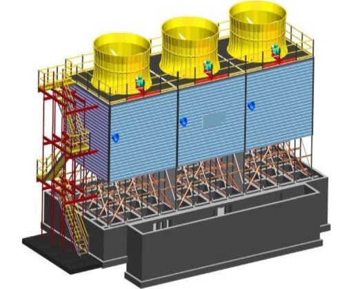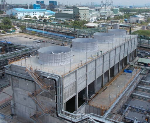 The structure of the tower as well as its columns and beams are produced with GRP. Various parts of the tower in direct contact with water such as drift eliminators, the water distribution system, and the fill are made of corrosion-resistant material like PVC, PP, GRP or stainless steel . Furthermore, the cold water basin at the bottom of the cooling tower can also be produced with GRP.
